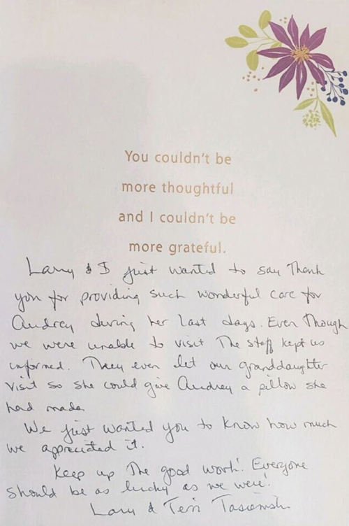 Larry & I just wanted to say thank you for providing such wonderful care for Audrey during her last days. Even though we were unable to visit, the staff kept us informed. they even let our granddaughter visit so she could give Audrey a pillow she had made. We just wanted you to know how much we appreciated it. Keep up the good work! Everyone should be as lucky as we were!